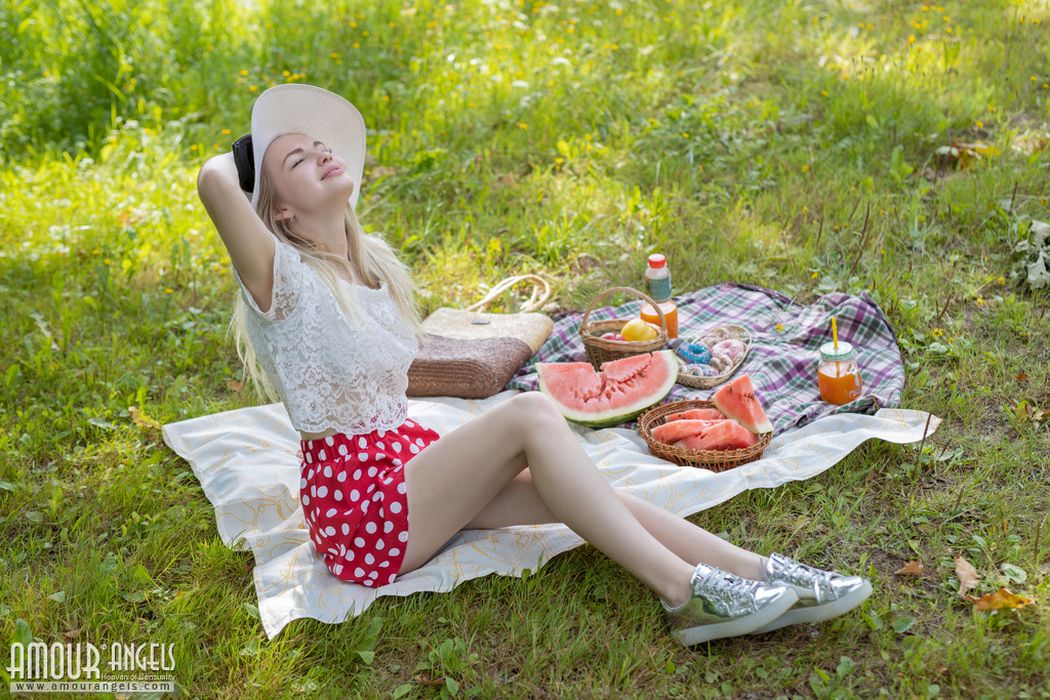 De knappe blonde tiener, die de hoofdrol speelt in de onderstaande fotorapportage, heeft een nogal vreemde hobby. Tenminste, dat vinden wij. Ze vindt het namelijk leuk om in haar eentje te gaan picknicken. Dat doet ze helemaal naakt en vervolgens zet ze haar tanden in haar favoriete gezonde snack, een watermeloen.