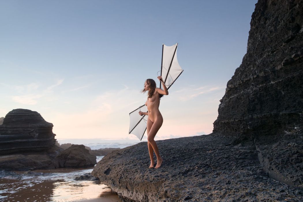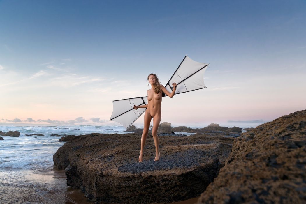 Tenminste, we gaan er van uit dat de fotograaf haar als een naakte engel ziet en niet als een vrouw, die in de fase “ik ben een vliegtuig” zit. Dat ze probeert op te stijgen met de twee vleugels die ze om haar armen heeft. Dan wordt het de hoogste tijd dat ze met een paar aardige meneren in witte jassen gaat praten en in huize Duinrust asbakjes gaat kleien.