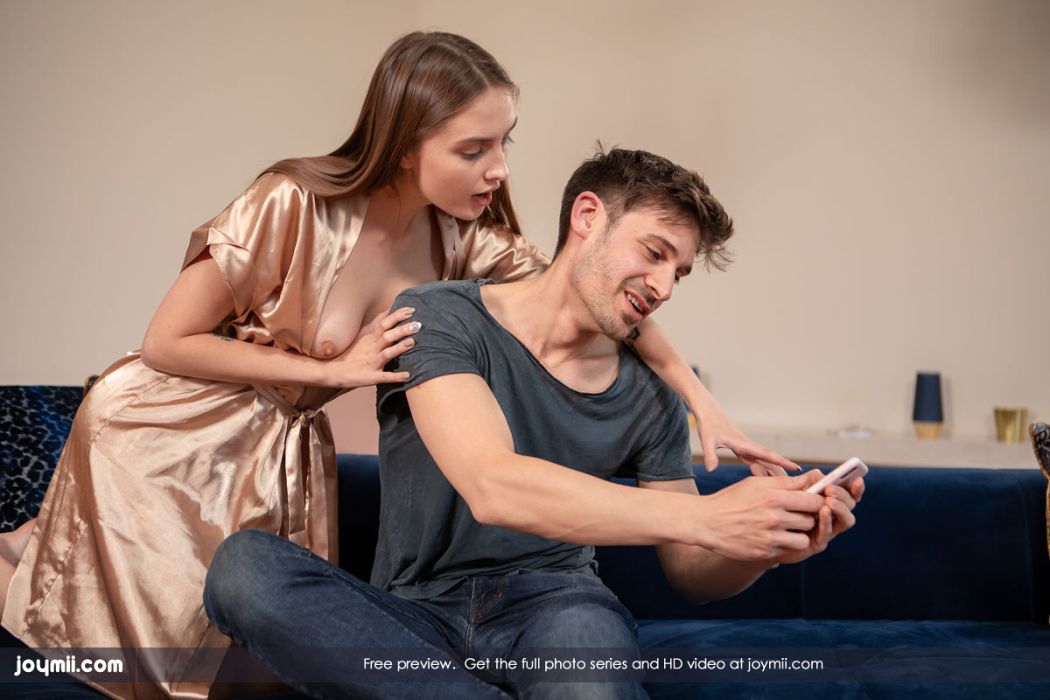 Ze had alleen een dunne peignoir aangedaan en keek vanaf een afstandje of haar plannetje ging werken. Op het moment dat haar stiefbroer naar haar naaktfoto’s aan het kijken was, maakte ze er een mooi toneelstukje van. Ze liep naar hem toe en riep dat hij niet op haar telefoon moest kijken en probeerde die uit zijn handen te pakken. Zogenaamd had ze niet door dat haar peignoir openging en ze wist dat ze beet had toen haar stiefbroer zich omdraaide en zonder wat te zeggen haar tieten begon te kneden. Ze ging gelijk in de aanval en maakte zijn spijkerbroek los en begon hem te pijpen.