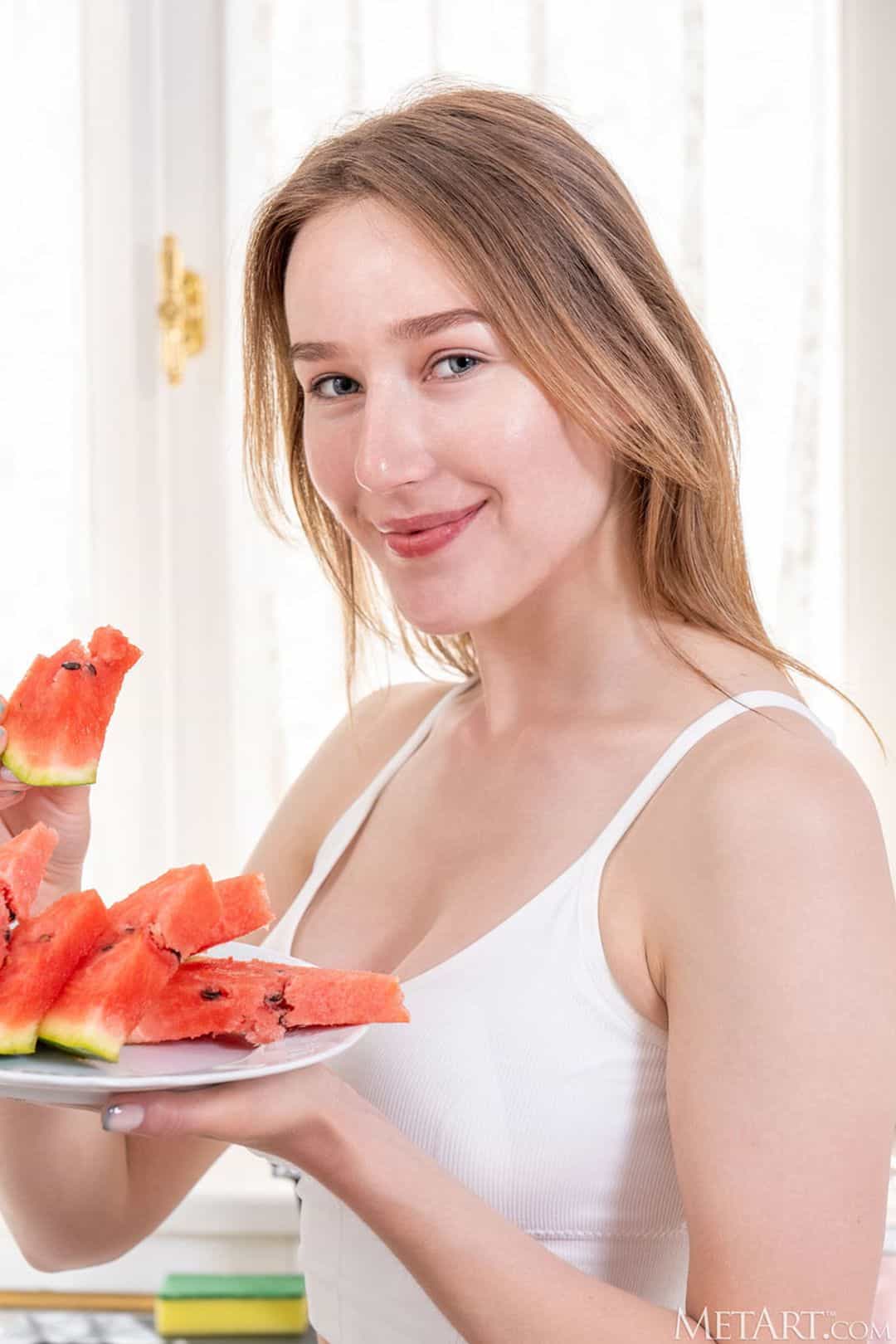 Overigens is zij niet de enige vrouw op Seks Met, die iets met meloenen heeft. Wat te denken van deze blonde tiener, die lekker in haar eentje gaat picknicken en vervolgens helemaal naakt aan een meloen begint.