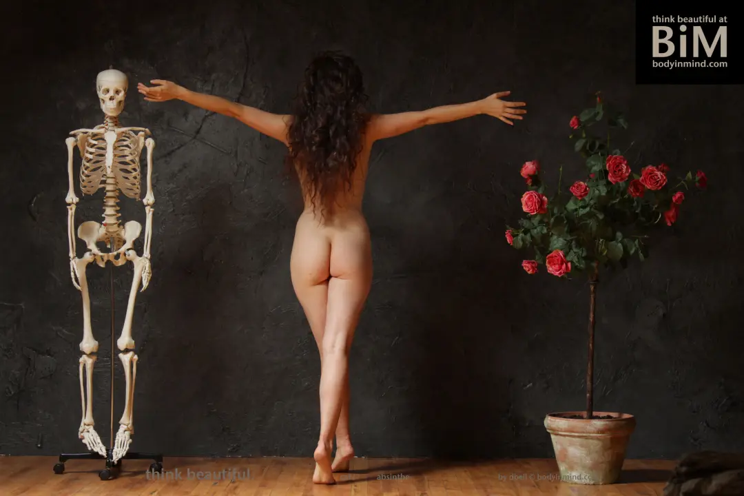 Net als haar overgrootmoeder, die er prachtig naakt uitziet op de historische foto’s, houdt de hedendaagse Cat ook van een glaasje absint op z’n tijd. Dat zou misschien een verklaring kunnen zijn voor haar totaal niet vreemde vriendschap met een skelet. Geen echte natuurlijk, want het is er eentje uit de feestwinkel. Neemt niet weg dat het op z’n zachtst gezegd verontrustend te noemen is dat ze graag naakt gaat en hand in hand met hem staat.