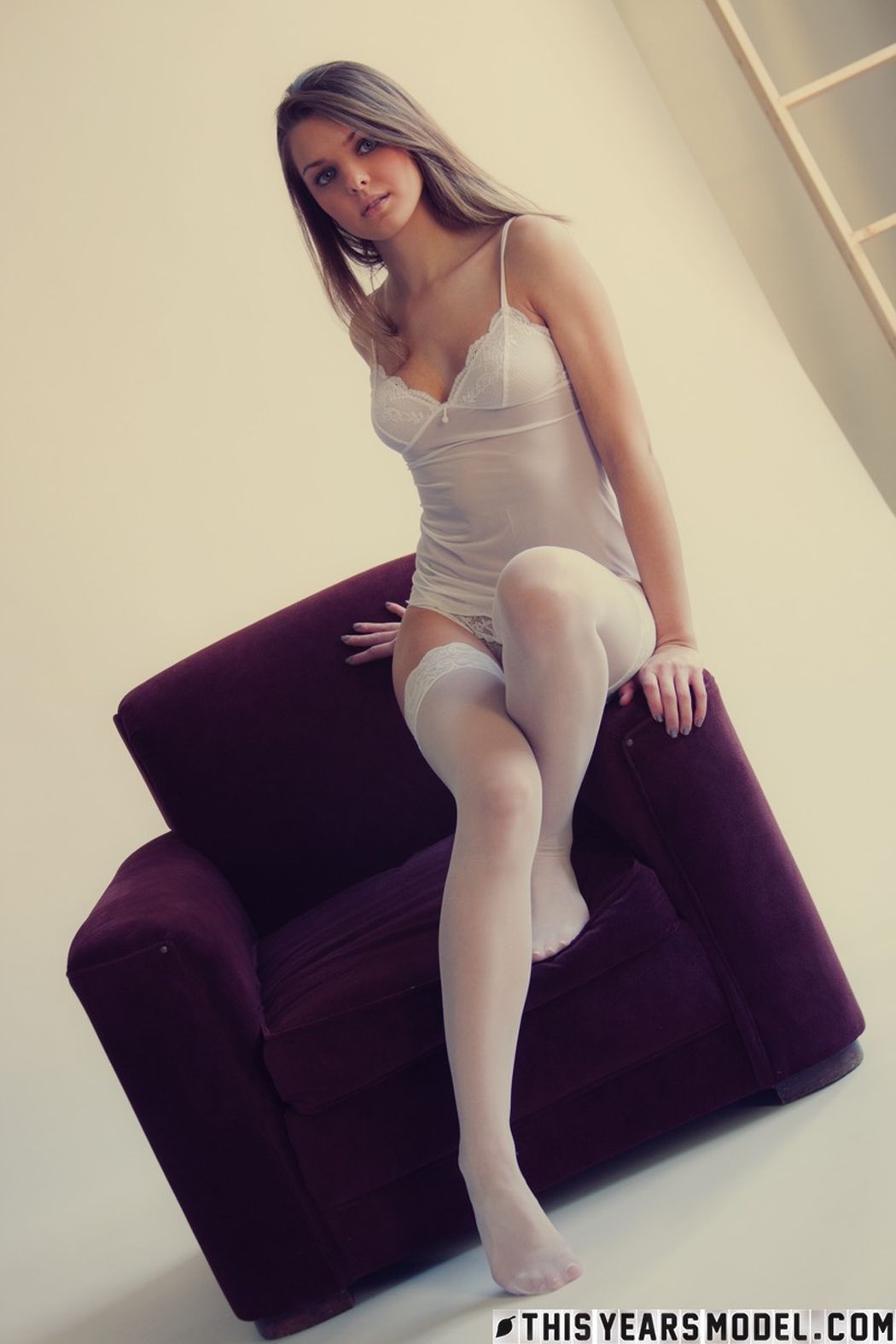Michelle Jean ziet er uitermate opwindend uit in sexy witte lingerie en het is helemaal top dat ze haar witte panty’s aanhoudt als ze verder helemaal naakt gaat.