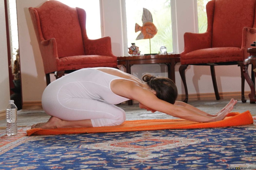 Jenni Lee moest even bijkomen en ging hem pijpen, zodat haar kutje even rust had. Dat duurde niet lang, want de man wilde meer. Hij neukte de knappe yoga vrouw eerst van achteren en daarna terwijl ze op haar rug lag. Hij bleek over een goede conditie te beschikken en voordat ze het doorhad, zat ze middenin haar tweede orgasme en werd haar kutje volgespoten met heet zaad.